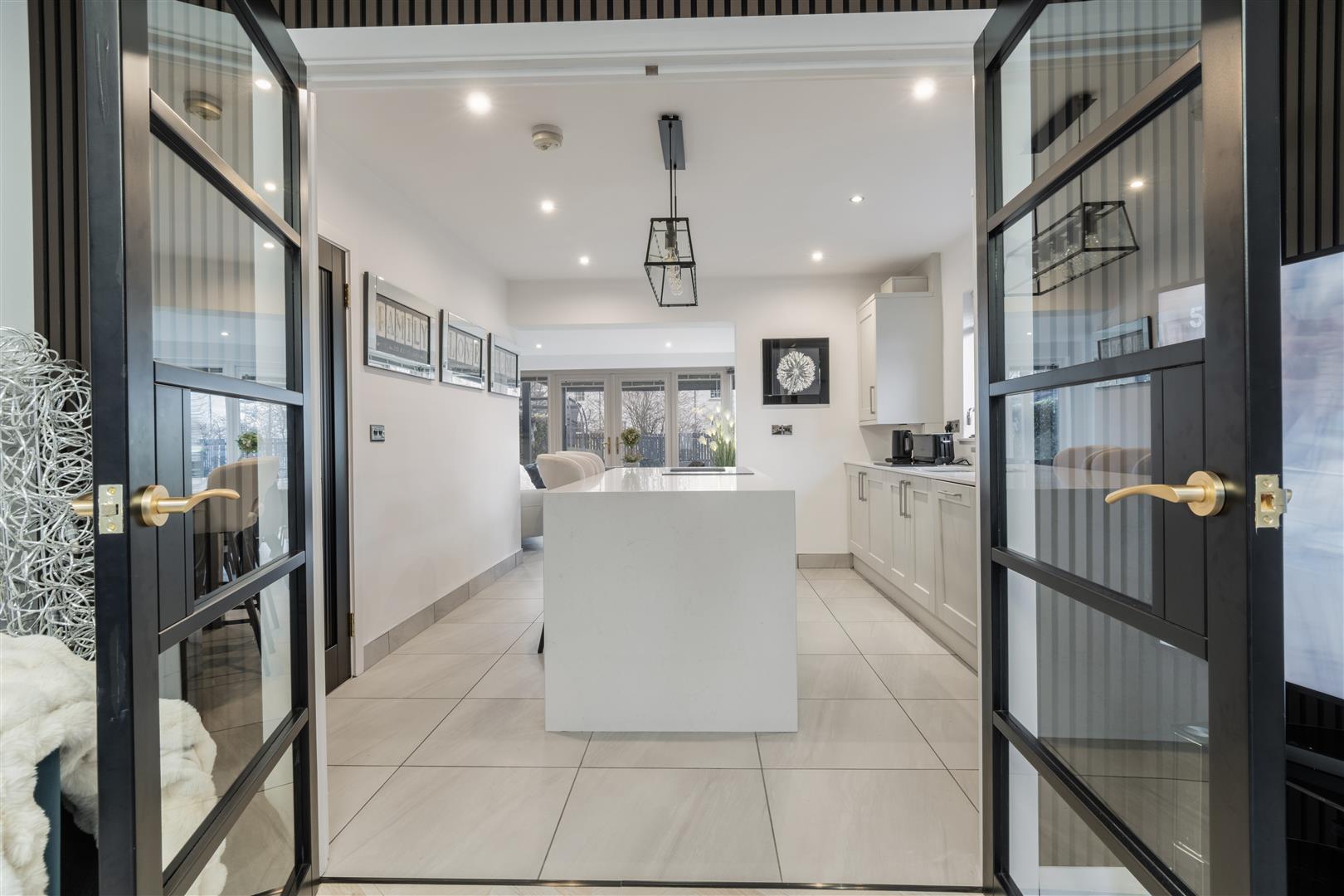 Finished to an exceptional standard throughout, the property showcases a modern open plan kitchen/living/dining, with high end finishes including Quartz countertops, a feature island, decorative wood panelling, and striking black framed glass doors which add a contemporary feel. The property also benefits from a generous rear garden, large metal detached shed, and a private driveway with ample parking .