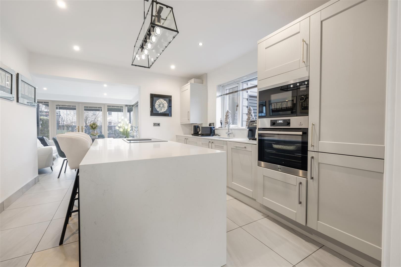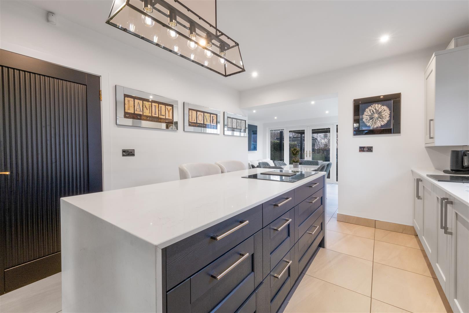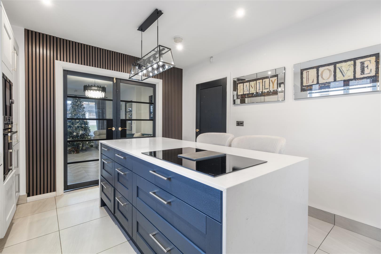 Modern open plan kitchen with a range of sleek high and low level units, Quartz worktops and feature island with breakfast bar. Integrated appliances including hob, oven, microwave and dishwasher. Contrasting navy island base and vertical panel feature wall add a high-end finish.