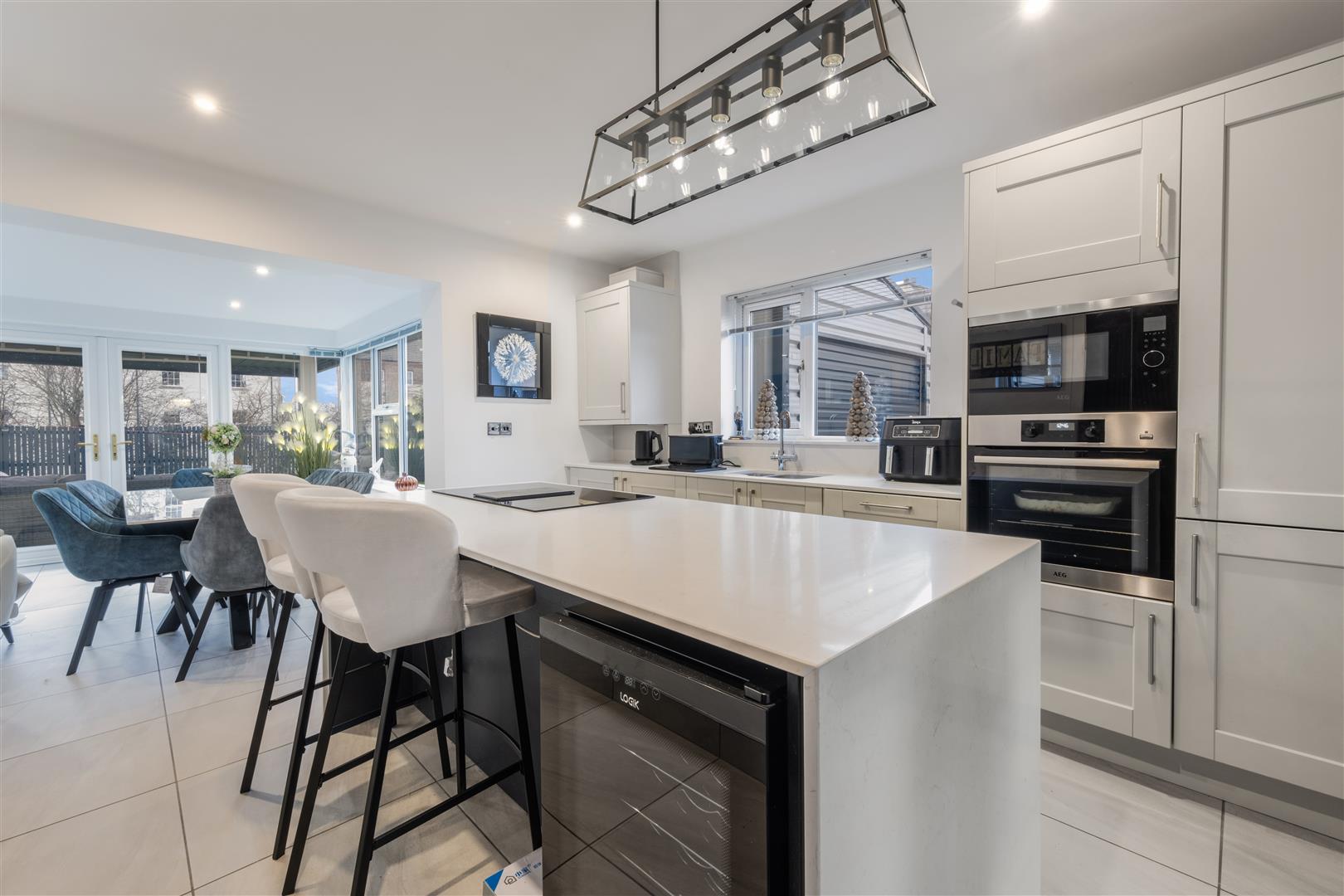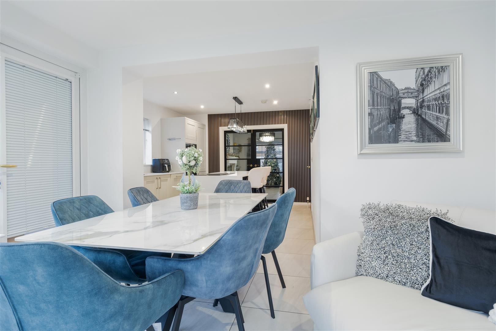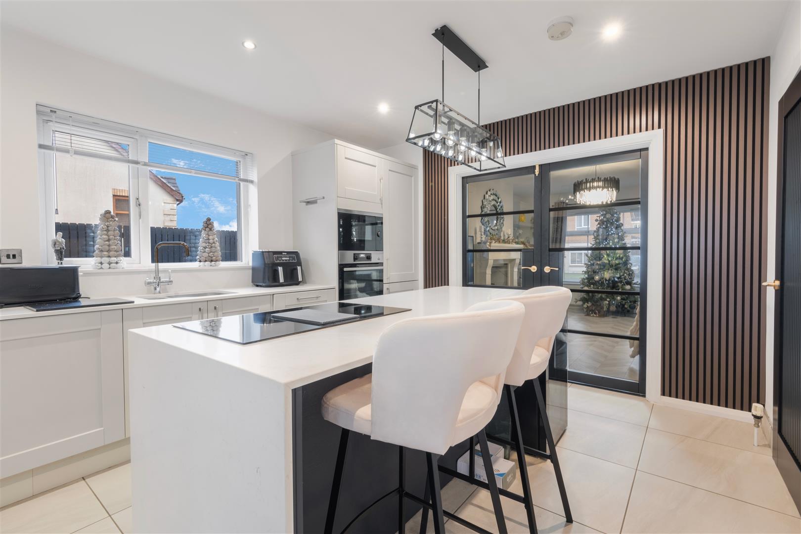 Modern open plan kitchen with a range of sleek high and low level units, Quartz worktops and feature island with breakfast bar. Integrated appliances including hob, oven, microwave and dishwasher. Contrasting navy island base and vertical panel feature wall add a high-end finish.