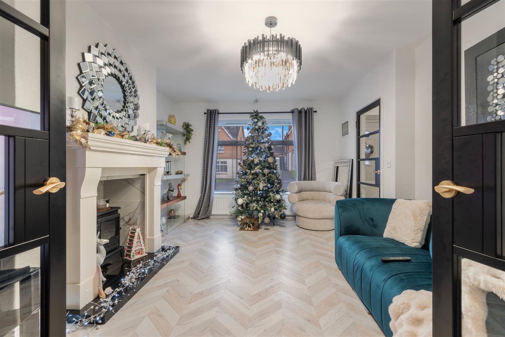 Spacious reception room featuring large picture window and cast iron stove on a granite hearth. Finished with herringbone wood flooring and bespoke panelling detail.