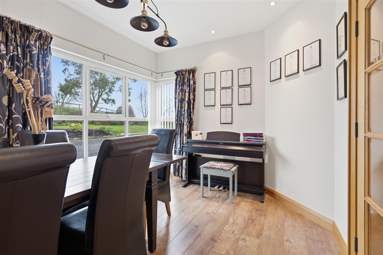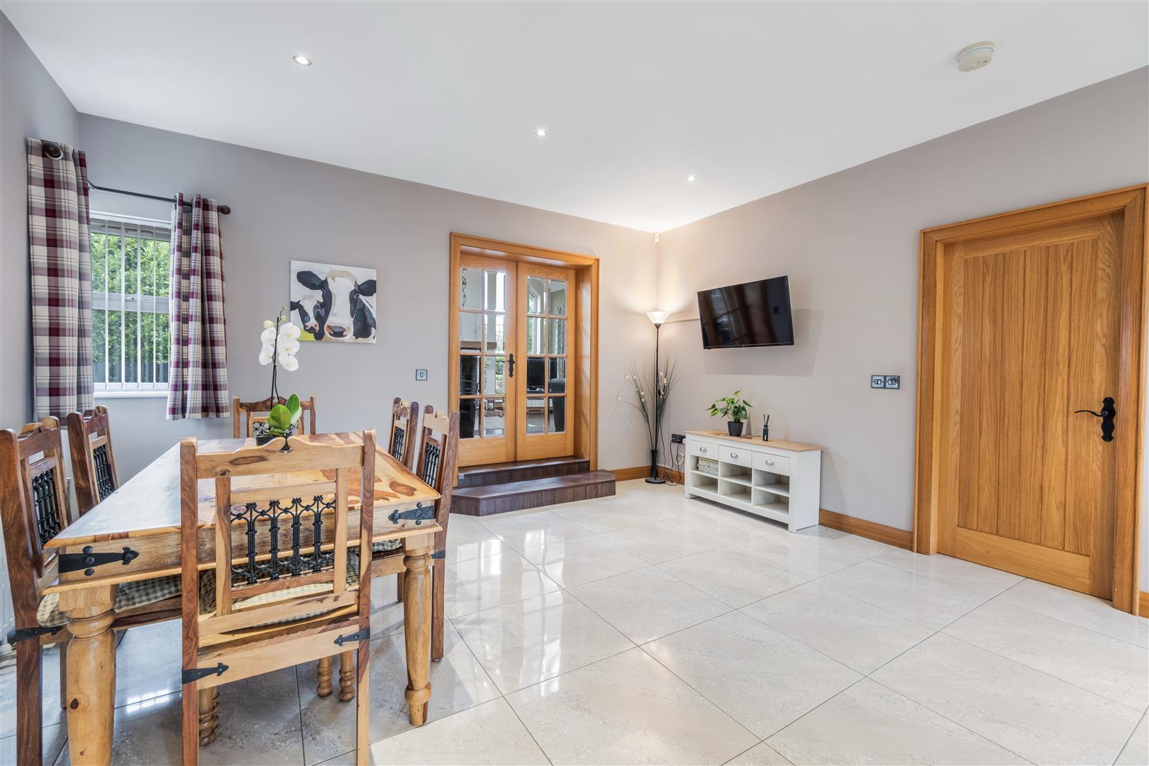 The ground floor comprises three generous reception areas, a large open-plan kitchen and dining space forming the heart of the home, and a feature sunroom enjoying views over the surrounding landscape. Additional accommodation includes a substantial laundry room, separate dining room, bedroom with en-suite provision, and a separate WC, all finished to a high standard and well suited to both family living and entertaining.
