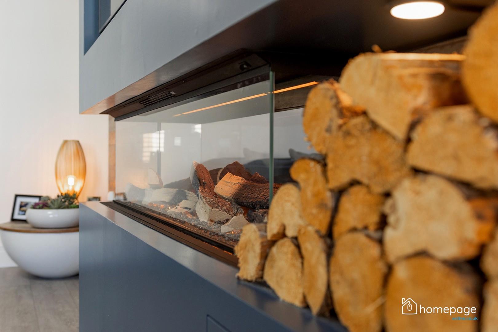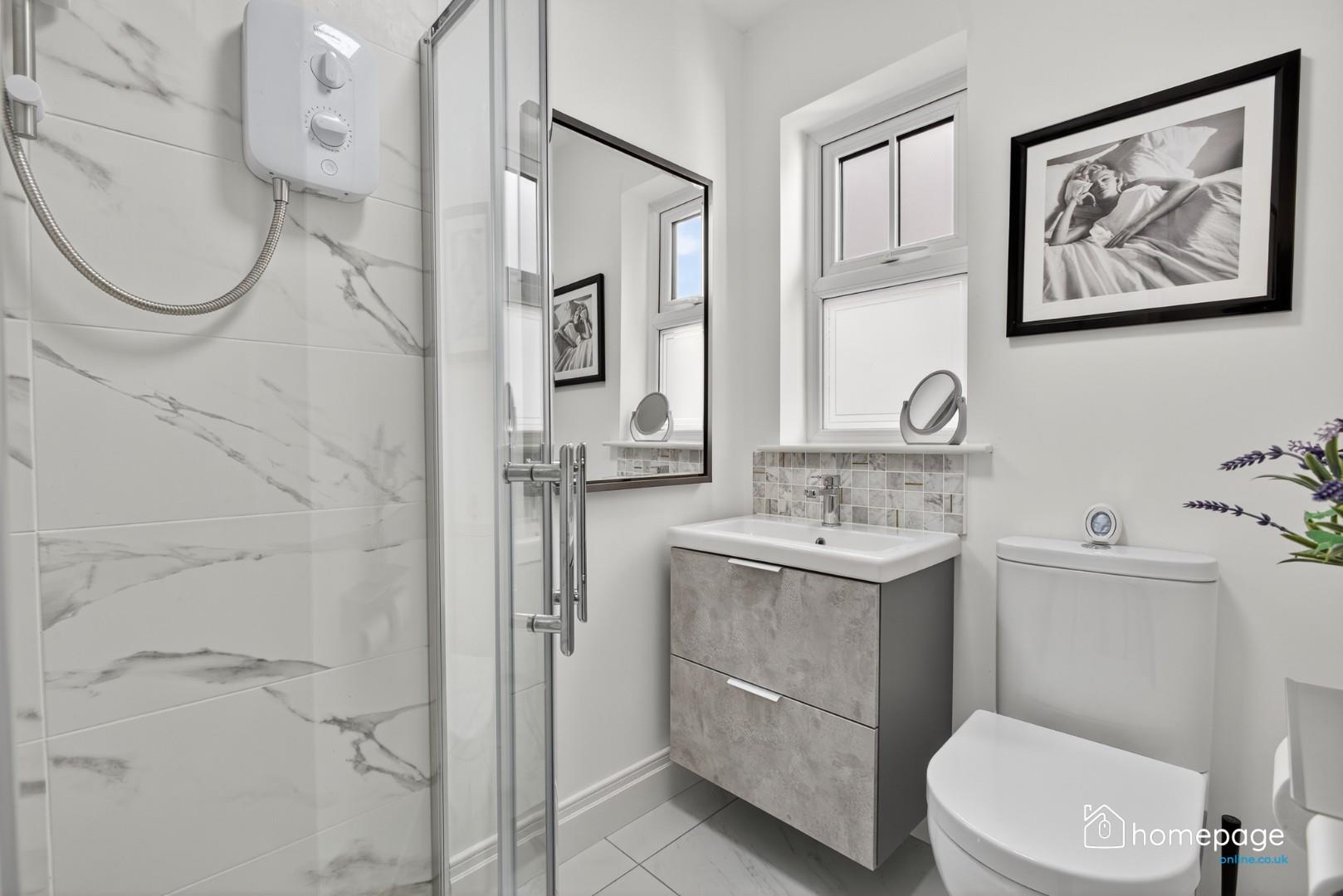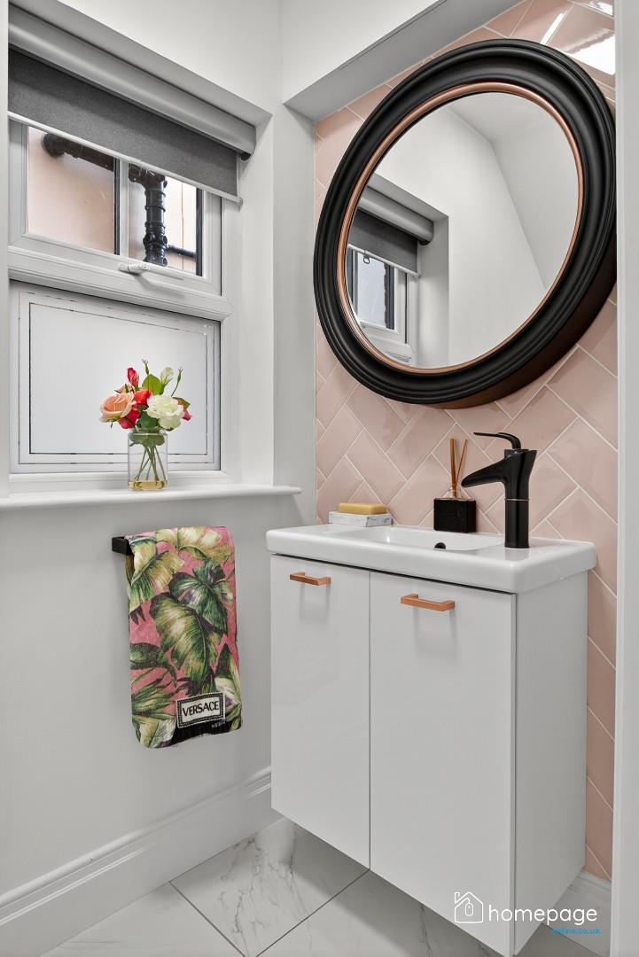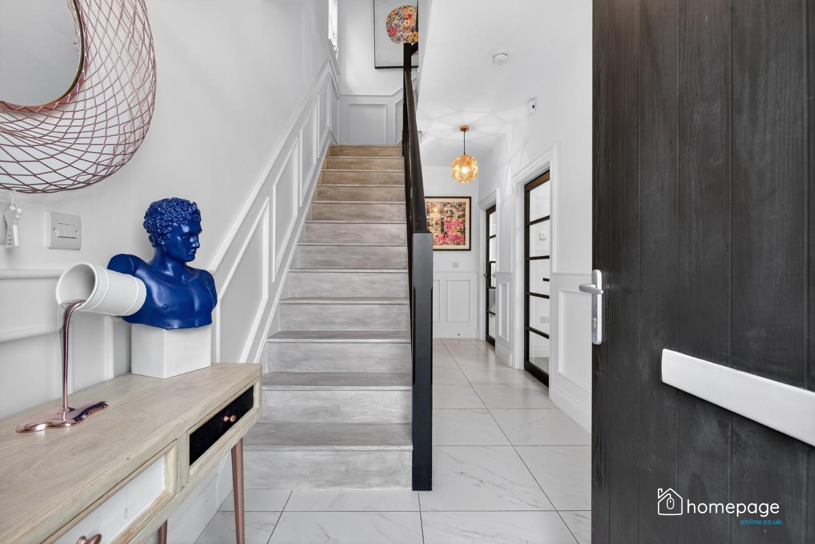 The ground floor comprises a bright entrance hallway with storage, large living room with bespoke feature media wall and inset fire, stylish open plan kitchen/dining area with centre island and integrated appliances. Double French doors lead from the seating area to the rear garden, while a separate WC completes the ground floor.