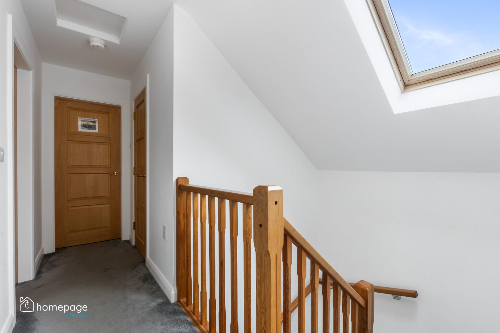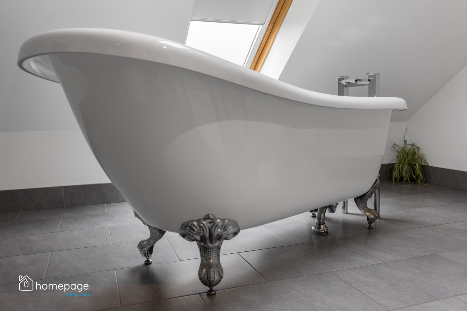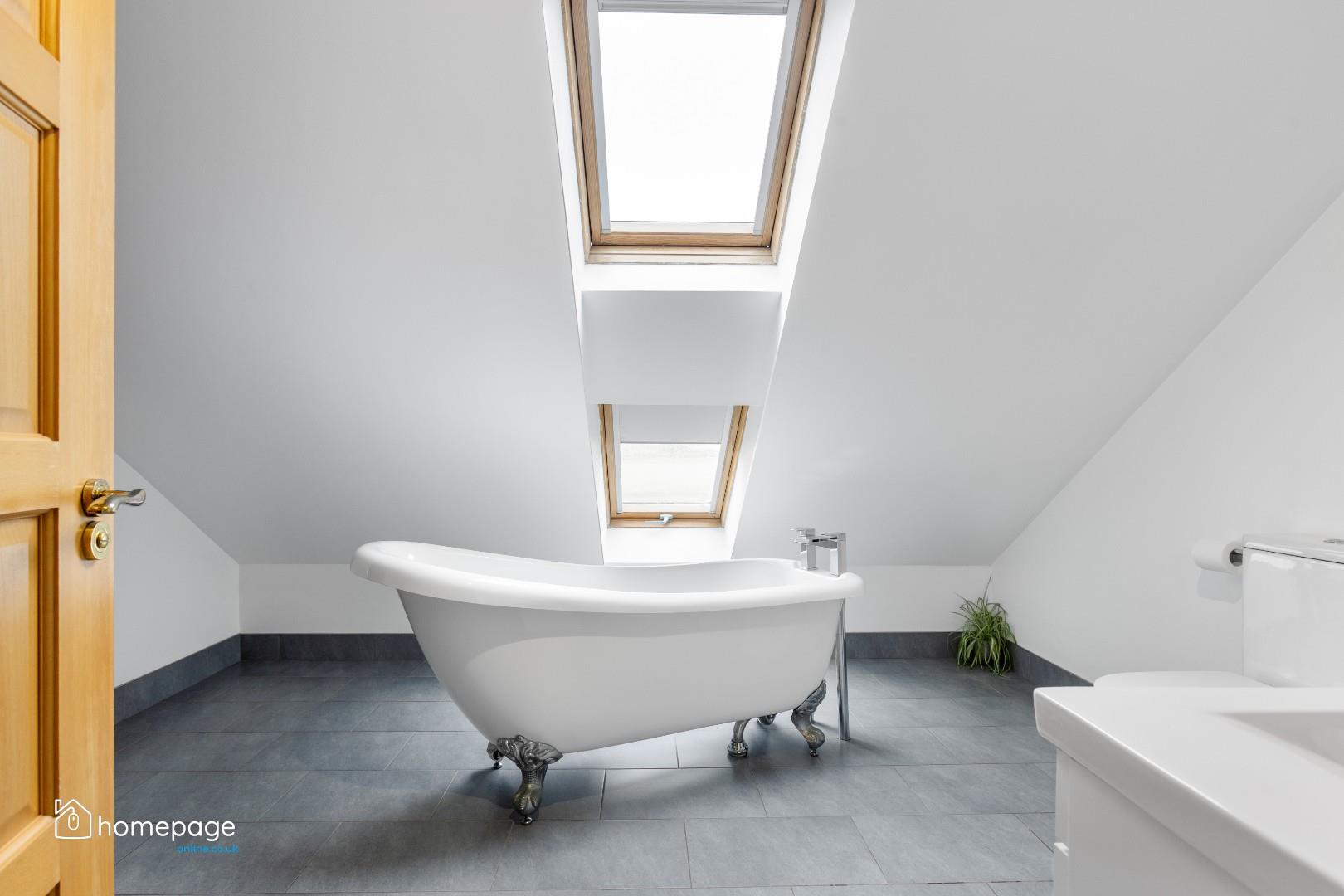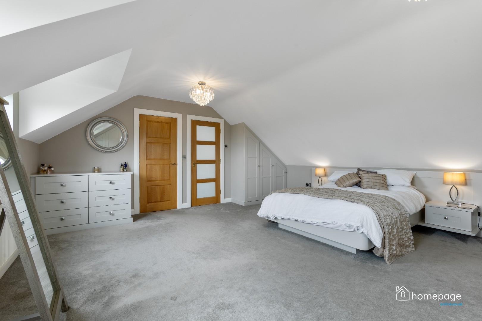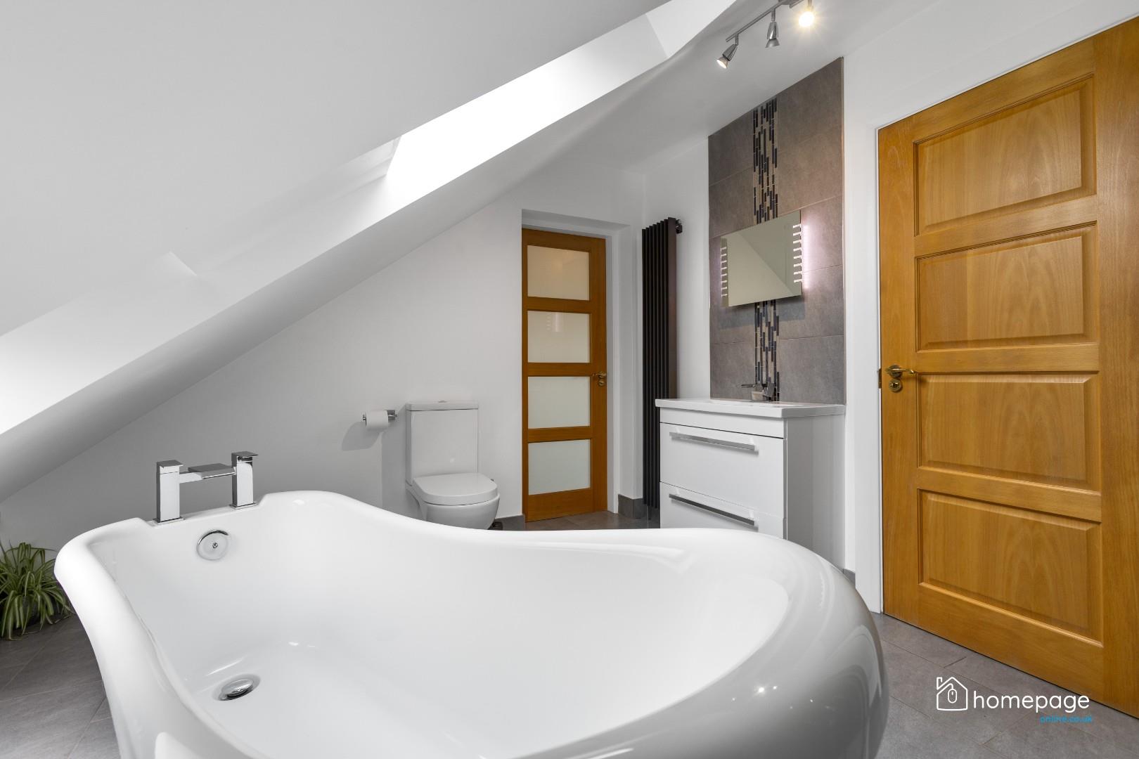Five double bedrooms are spread across both floors, three of which benefit from ensuite facilities, including a luxurious main bedroom with fitted furniture and access to a stunning bathroom with free-standing tub and skylight views.