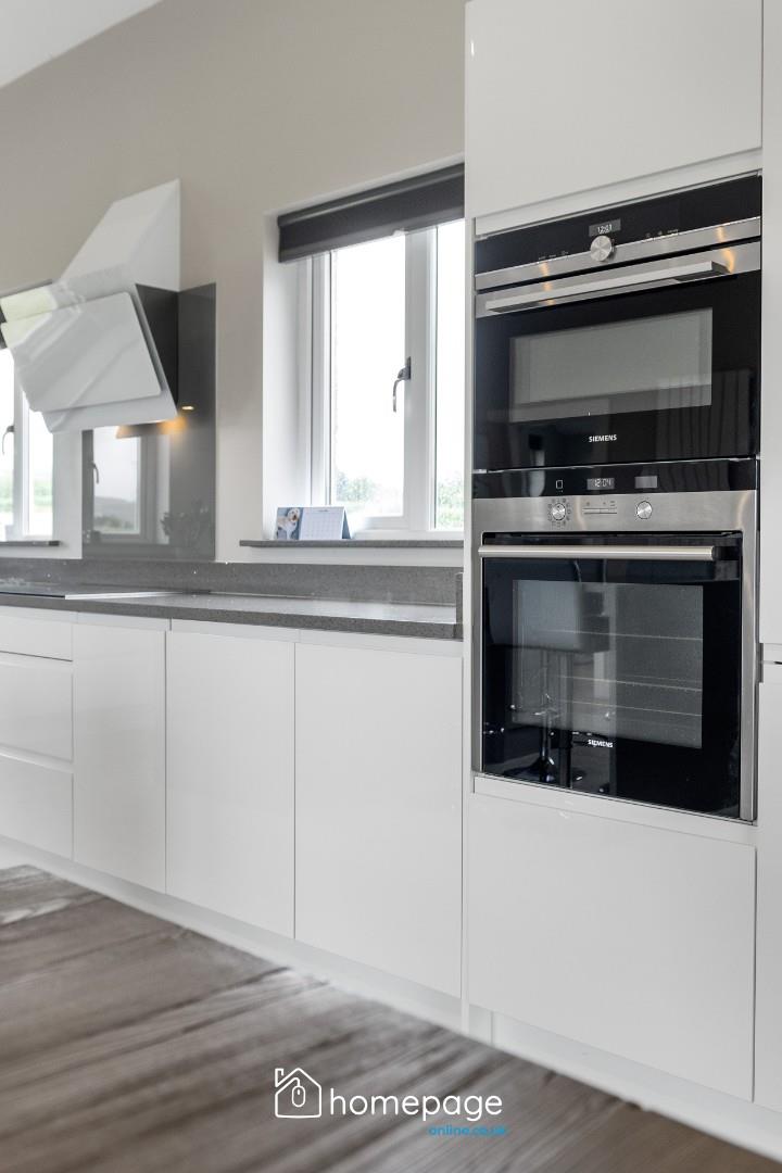 Internally, the home offers bright and expansive accommodation over two floors, including two generous reception rooms and a striking open-plan kitchen/living/dining space, complete with vaulted ceilings, quartz worktops, Siemens integrated appliances, and a boiling water tap. The main lounge features solid oak flooring, feature wood-burning stove with integrated boiler, and impressive views sea views towards Portstewart.