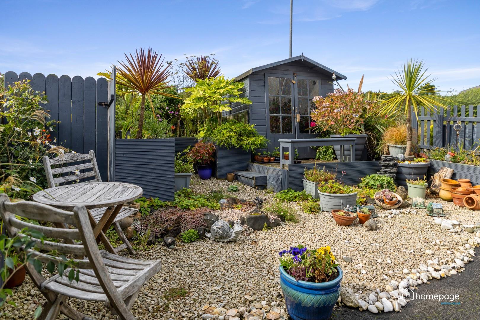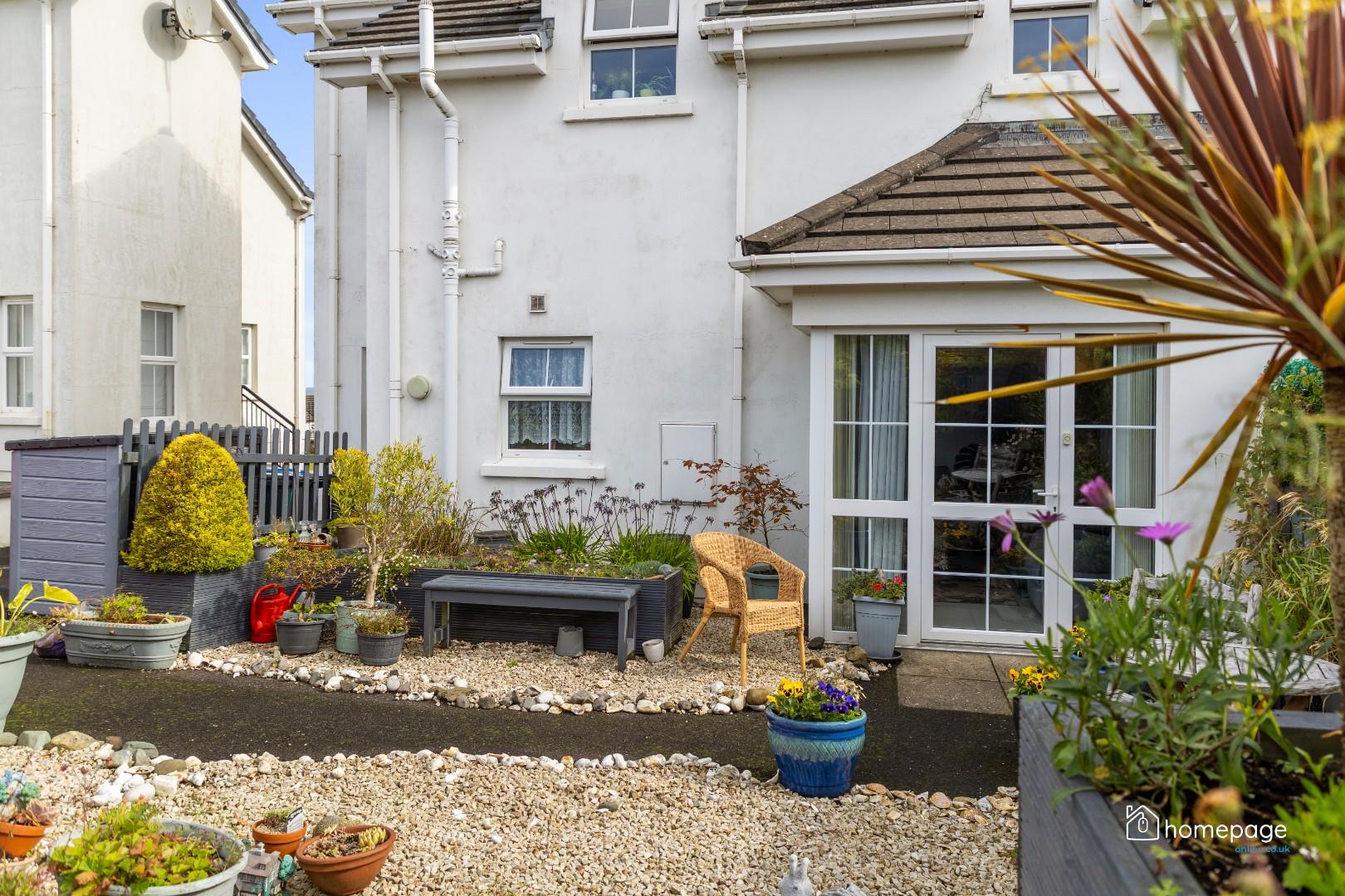 The property is approached by a stepped pathway at the front, with a lawned garden edged by a variety of shrubs and plants and a paved section leading to the entrance. A tarmac driveway lies to the side, accessed from the rear, alongside a low-maintenance stoned garden enclosed by low-level close-board fencing